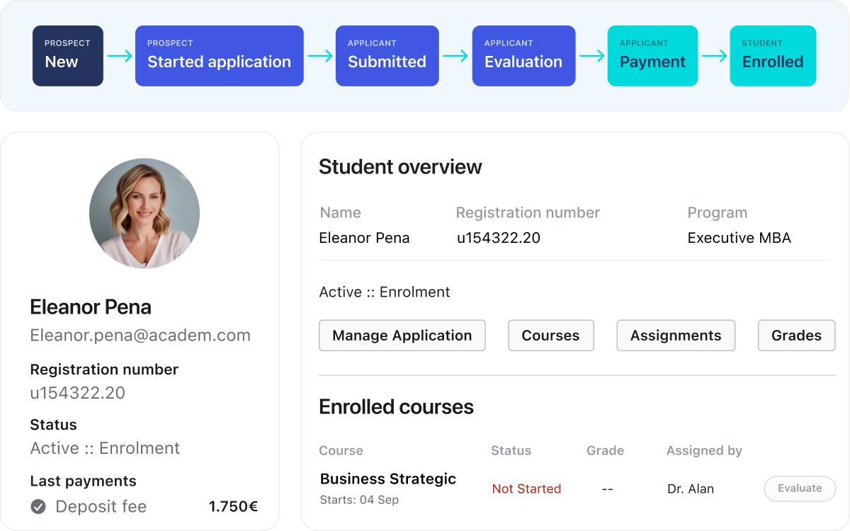 Connect recruitment, admissions, enrolment, and student records in a single platform, so leadership teams stop chasing spreadsheets and start making decisions with accurate, real-time data.
